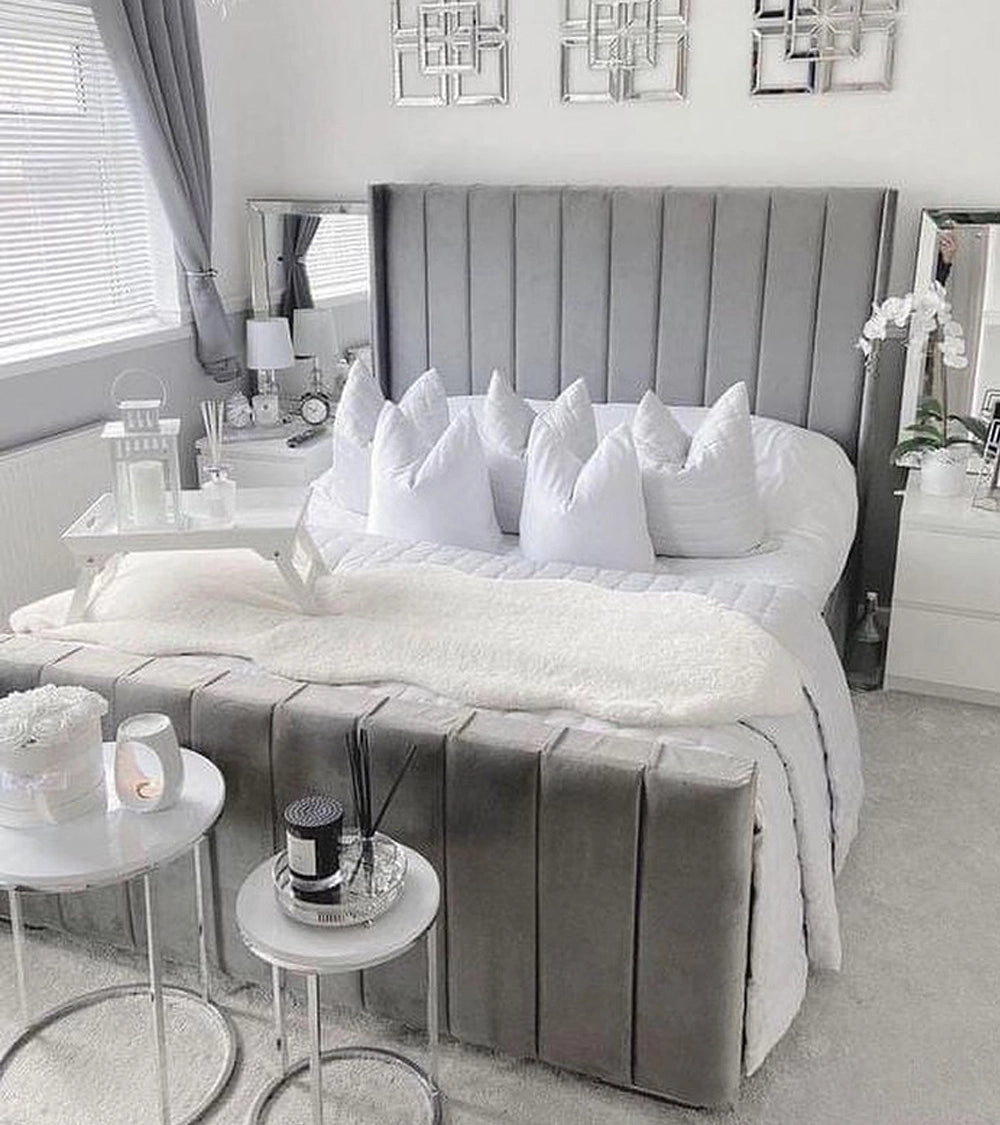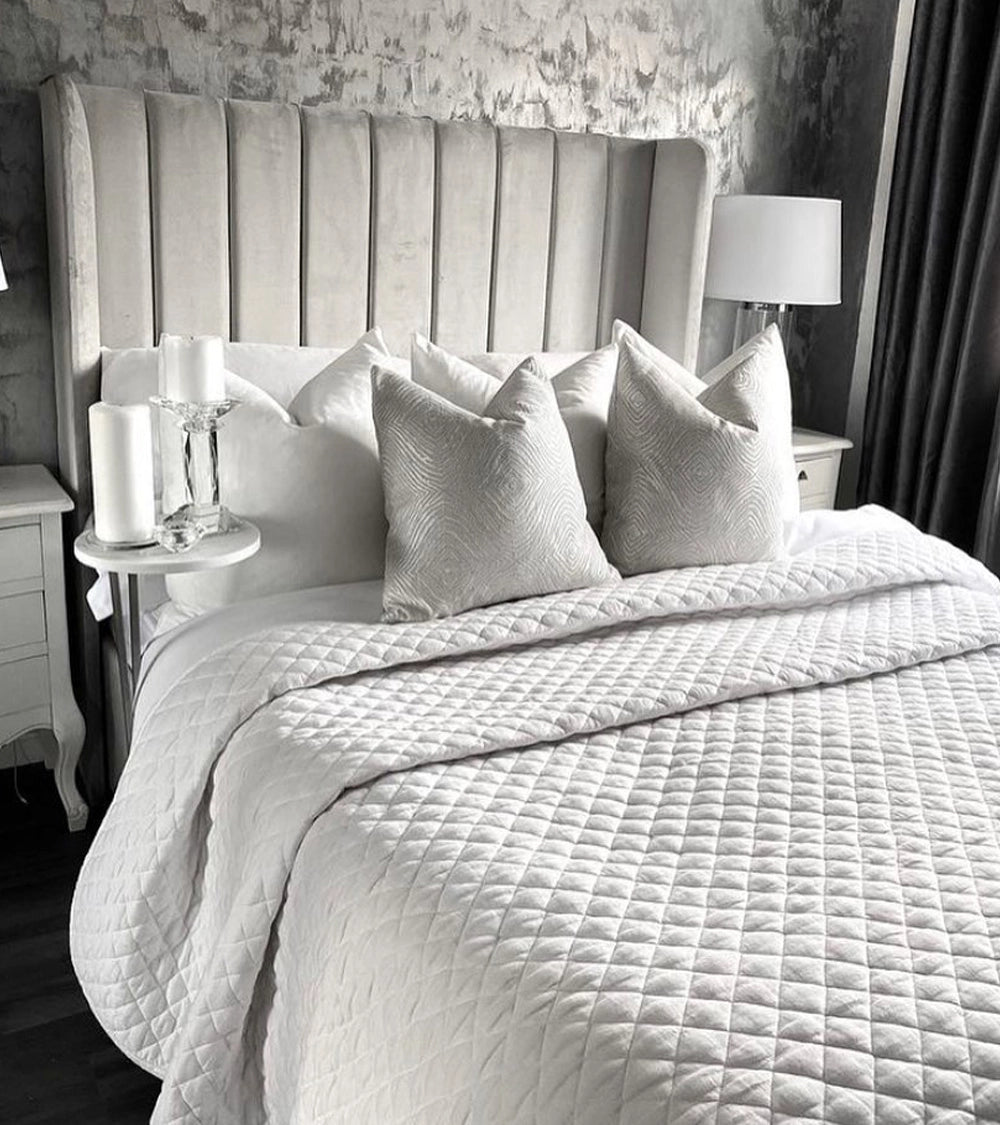 - Design chic : Une tête de lit en velours capitonné avec des ailes latérales pour un effet cocooning et moderne.