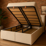 Lit Coffre Oslo Beige Capitonné avec Matelas Ressorts Ensachés 25 cm – 140x190 et 160x200