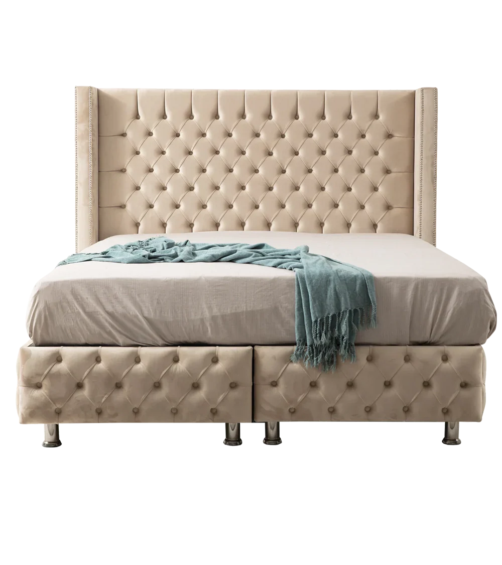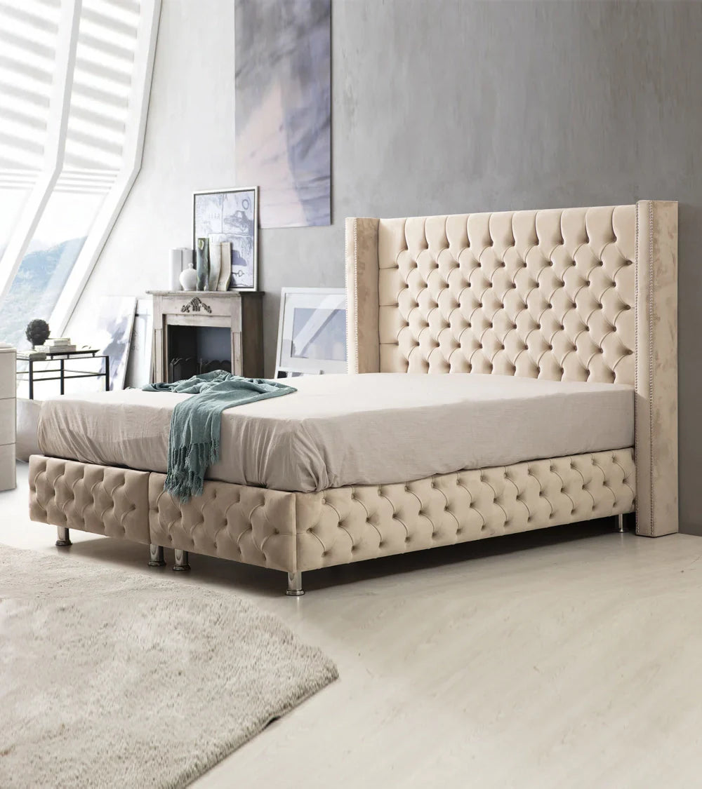 - Cadre de lit en tissu velours beige doux au toucher avec des finitions travaillées.