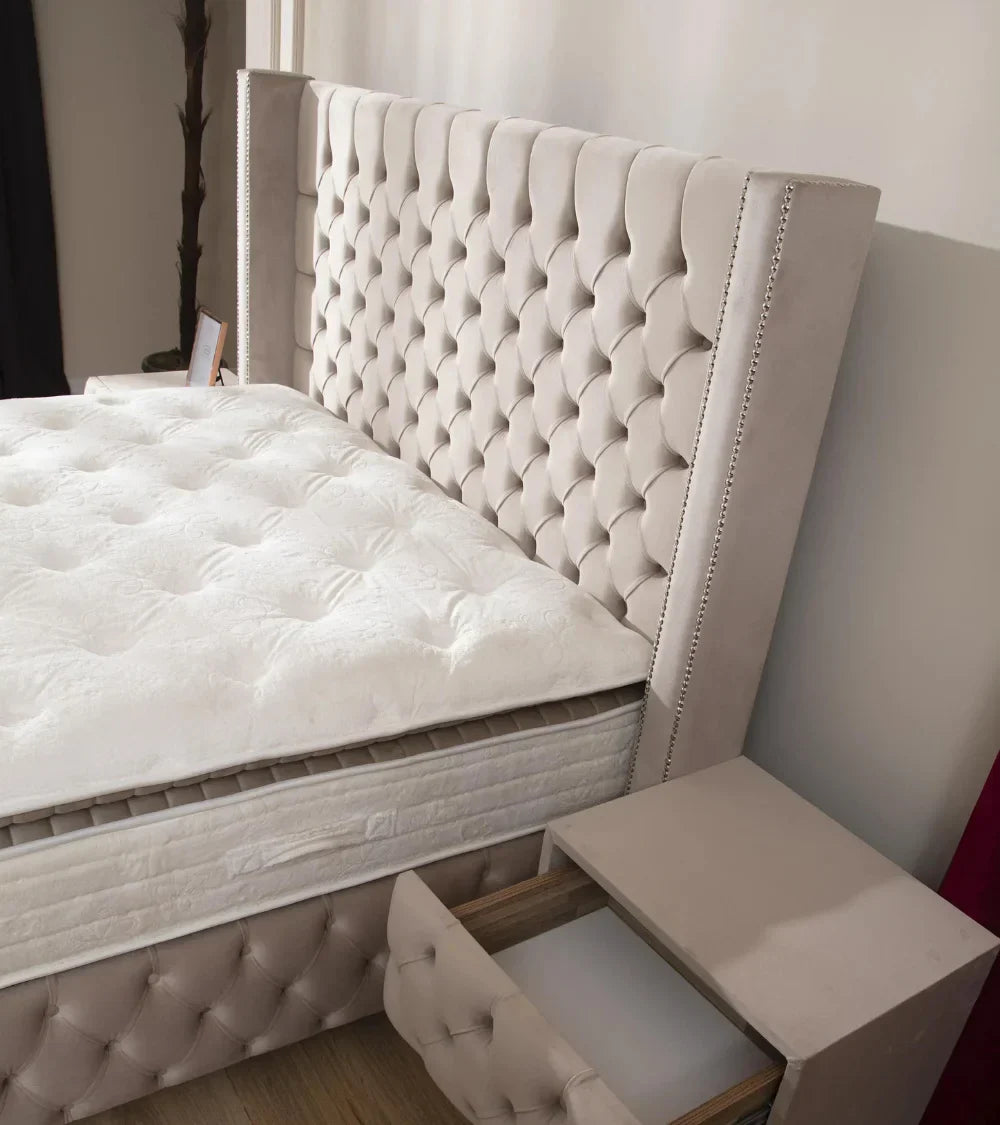 - Tête de lit capitonnée en velours avec mousse HR pour un soutien confortable.